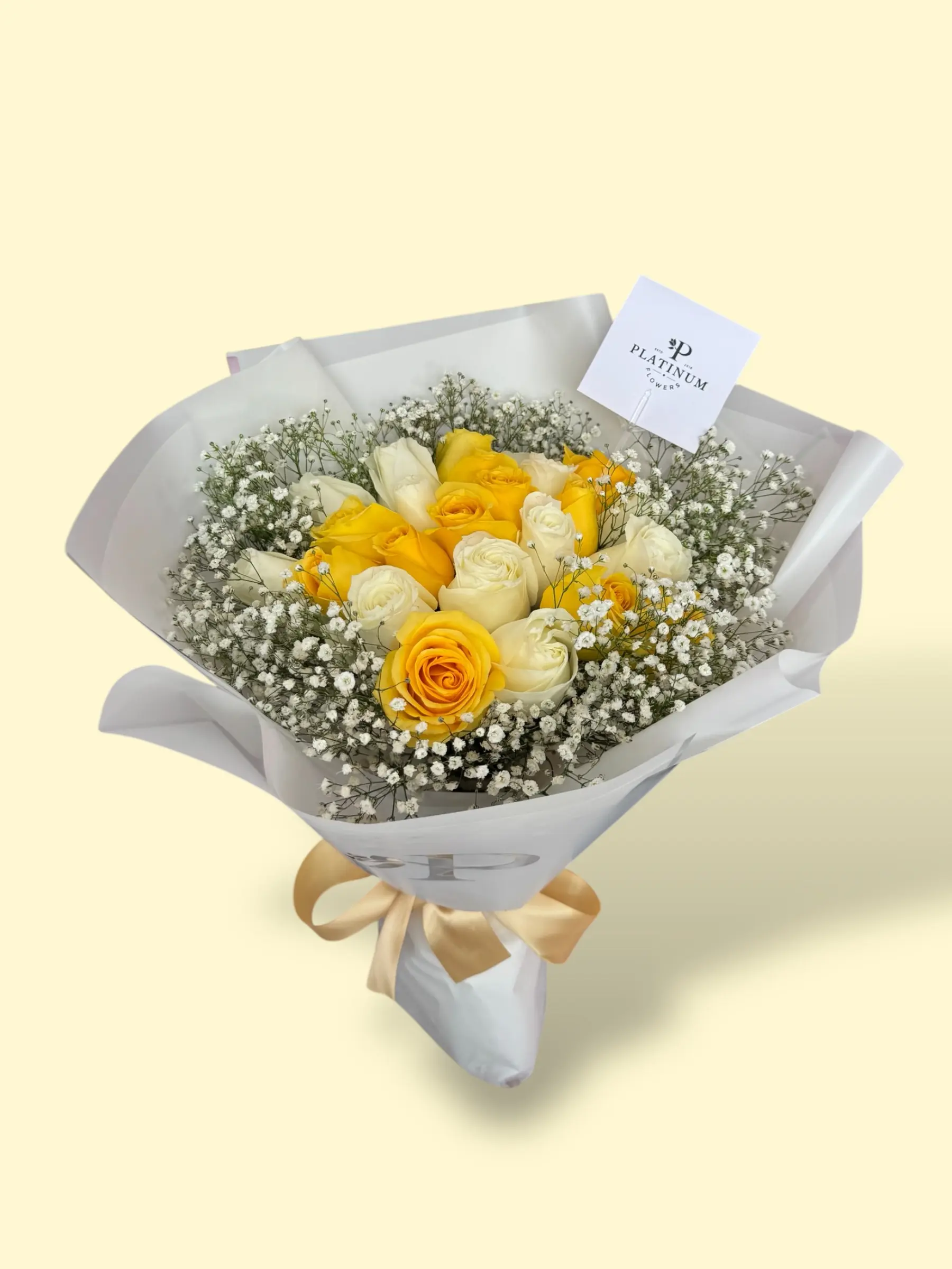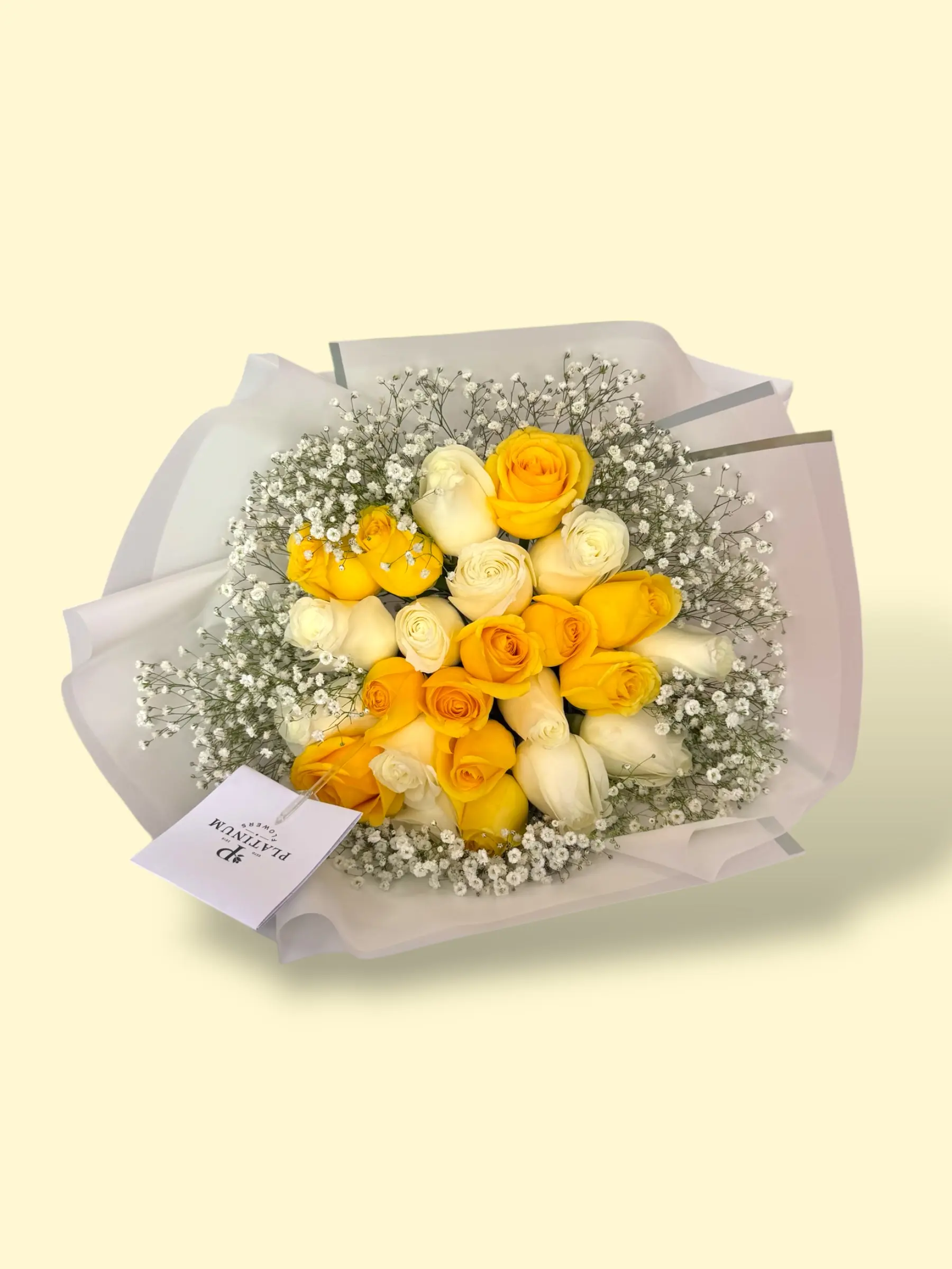 Regala alegría y ternura con un elegante mix de 24 rosas amarillas y blancas acompañadas de gypso, haciendo que quien lo reciba se sienta especial y única. Es la opción ideal para sorprender y llenar de luz a esa persona querida.