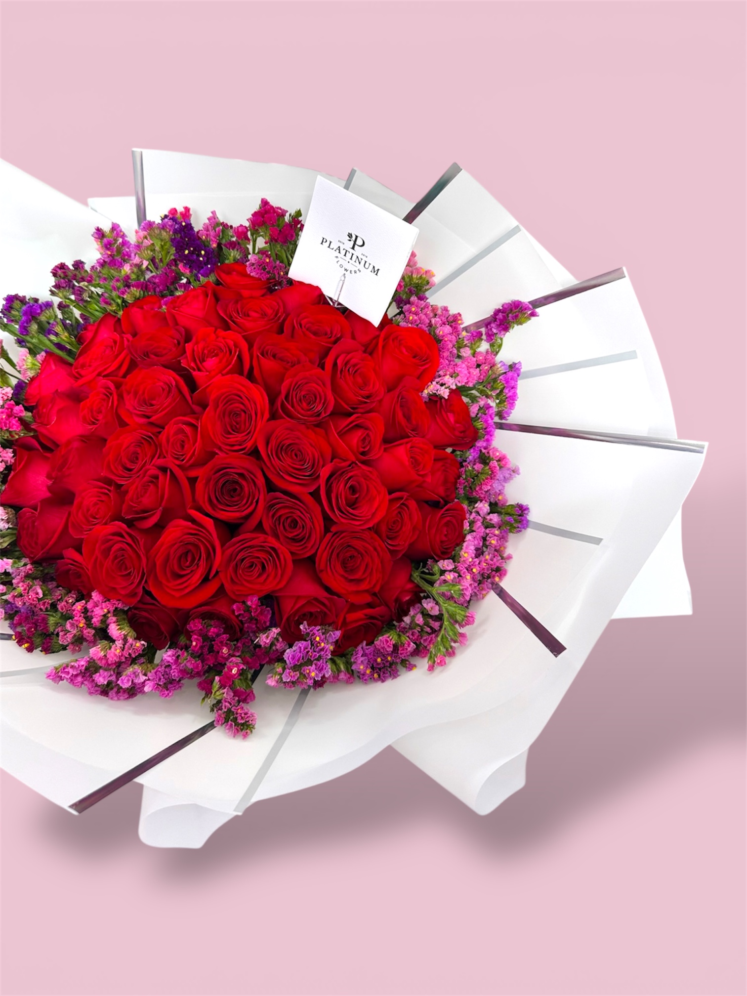 Las rosas rojas acompañadas de leticia aportan movimiento y estructura, logrando un bouquet equilibrado y con gran presencia, elaborado con el estilo característico de Platinum Flowers.