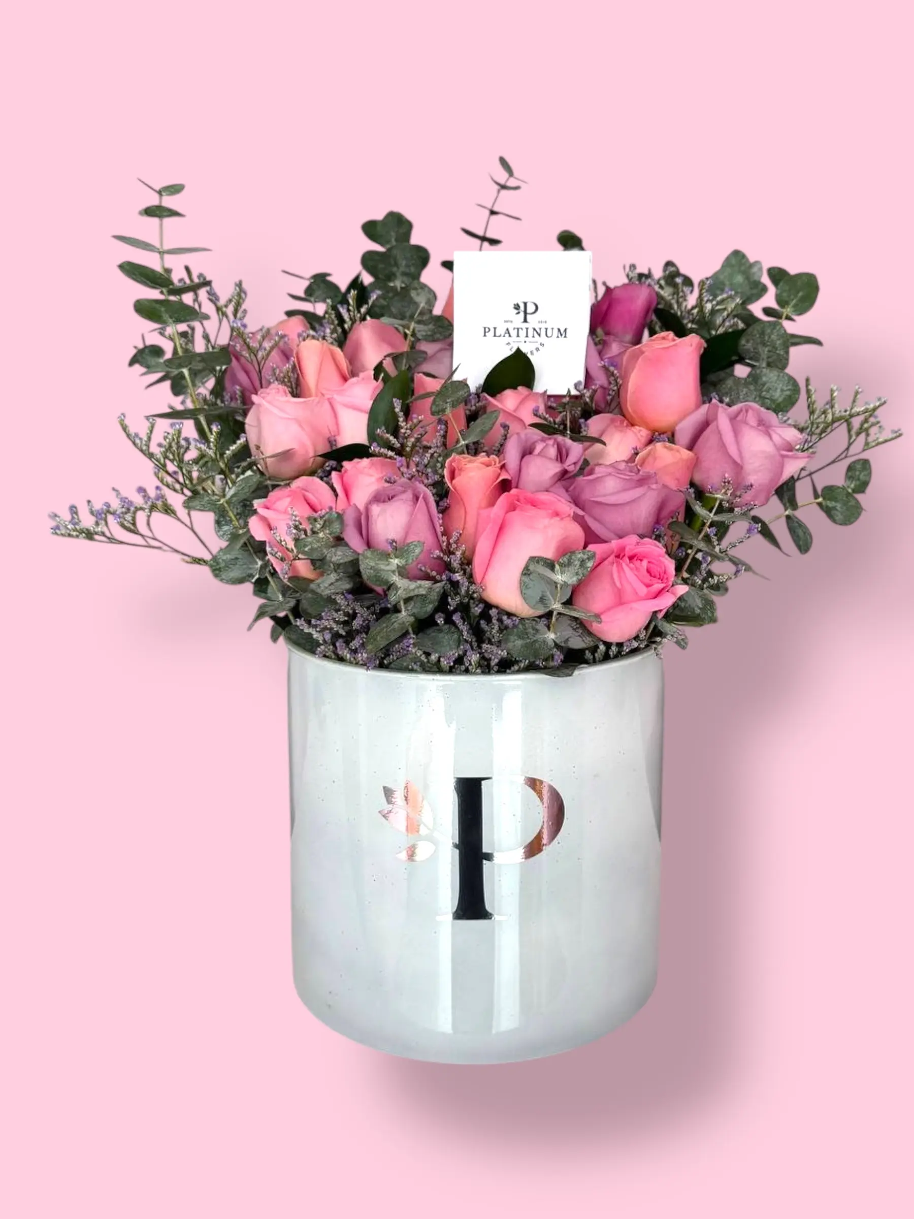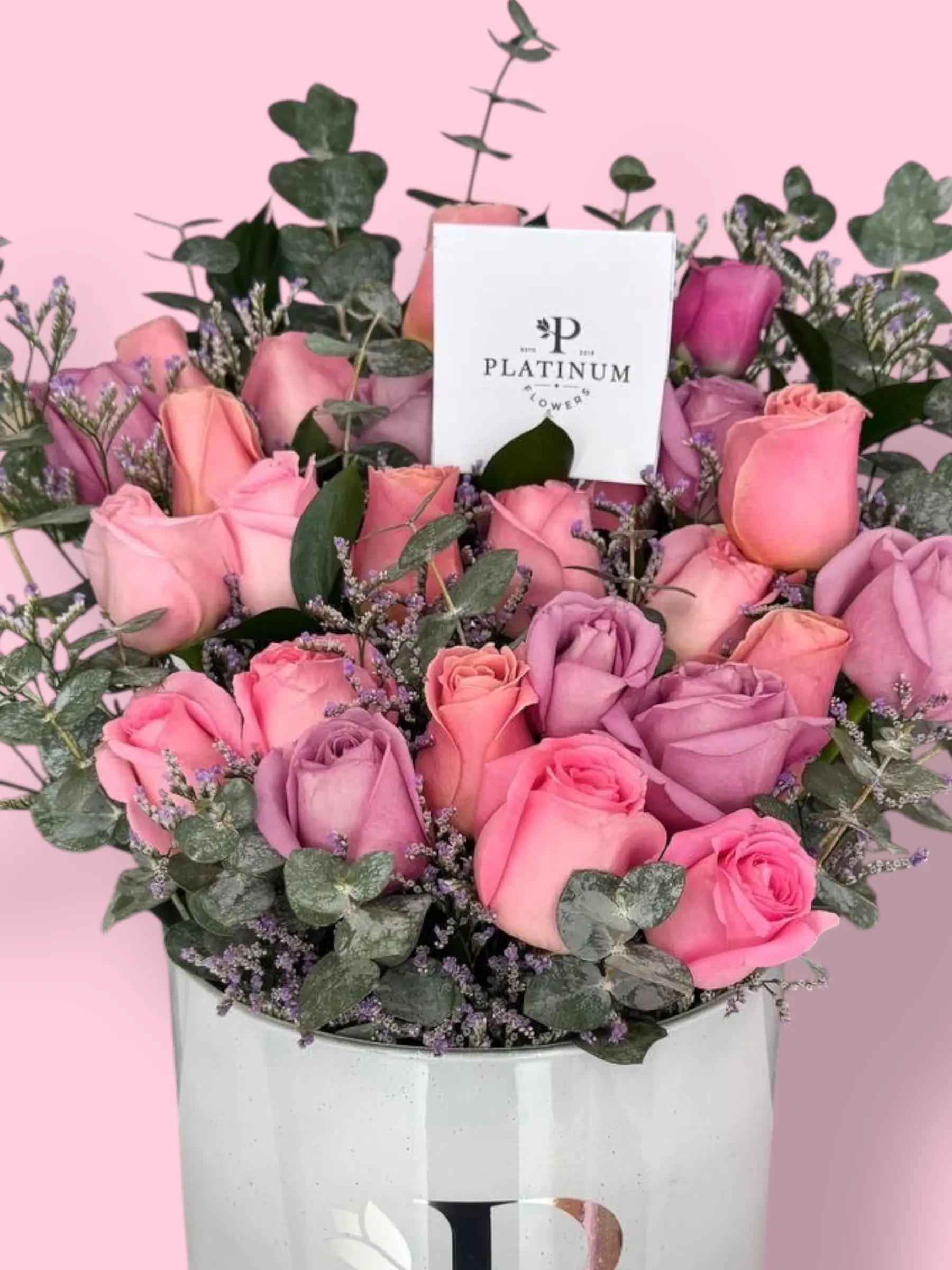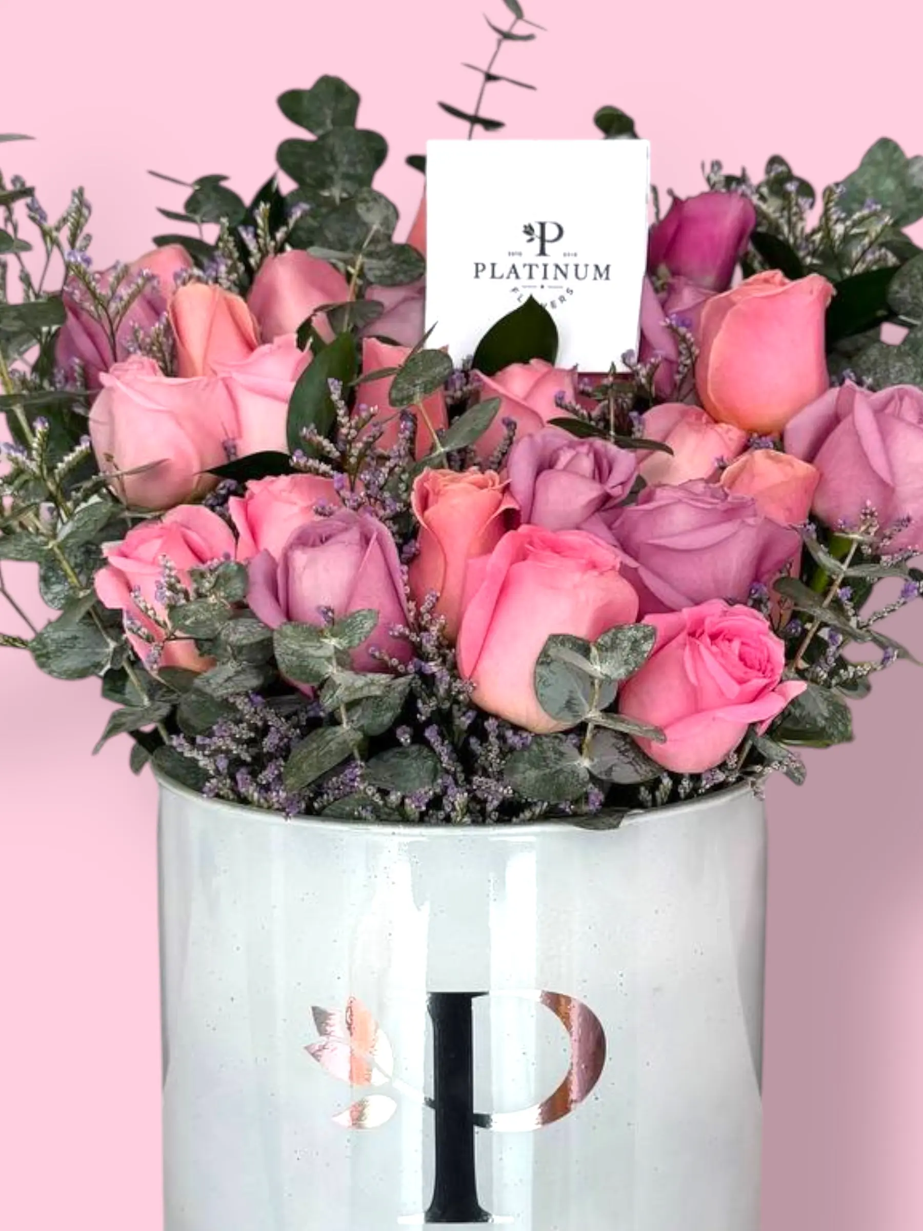 Elegancia es la definición perfecta del cilindro de 24 Rosas con limonium y dolar, demuestra tu amor con este hermoso regalo.