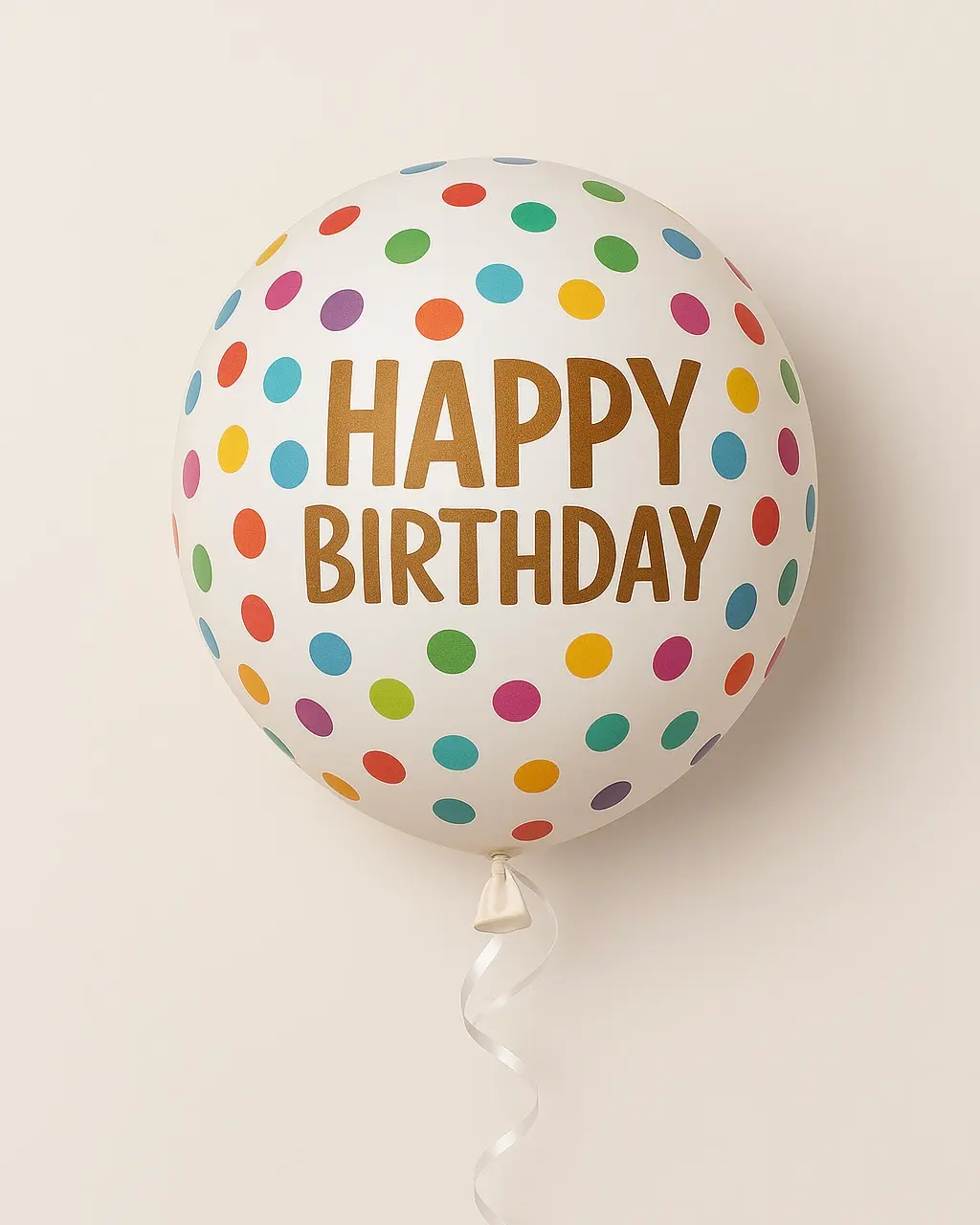 Globo blanco con lunares de colores y frase happy birthday en dorado.