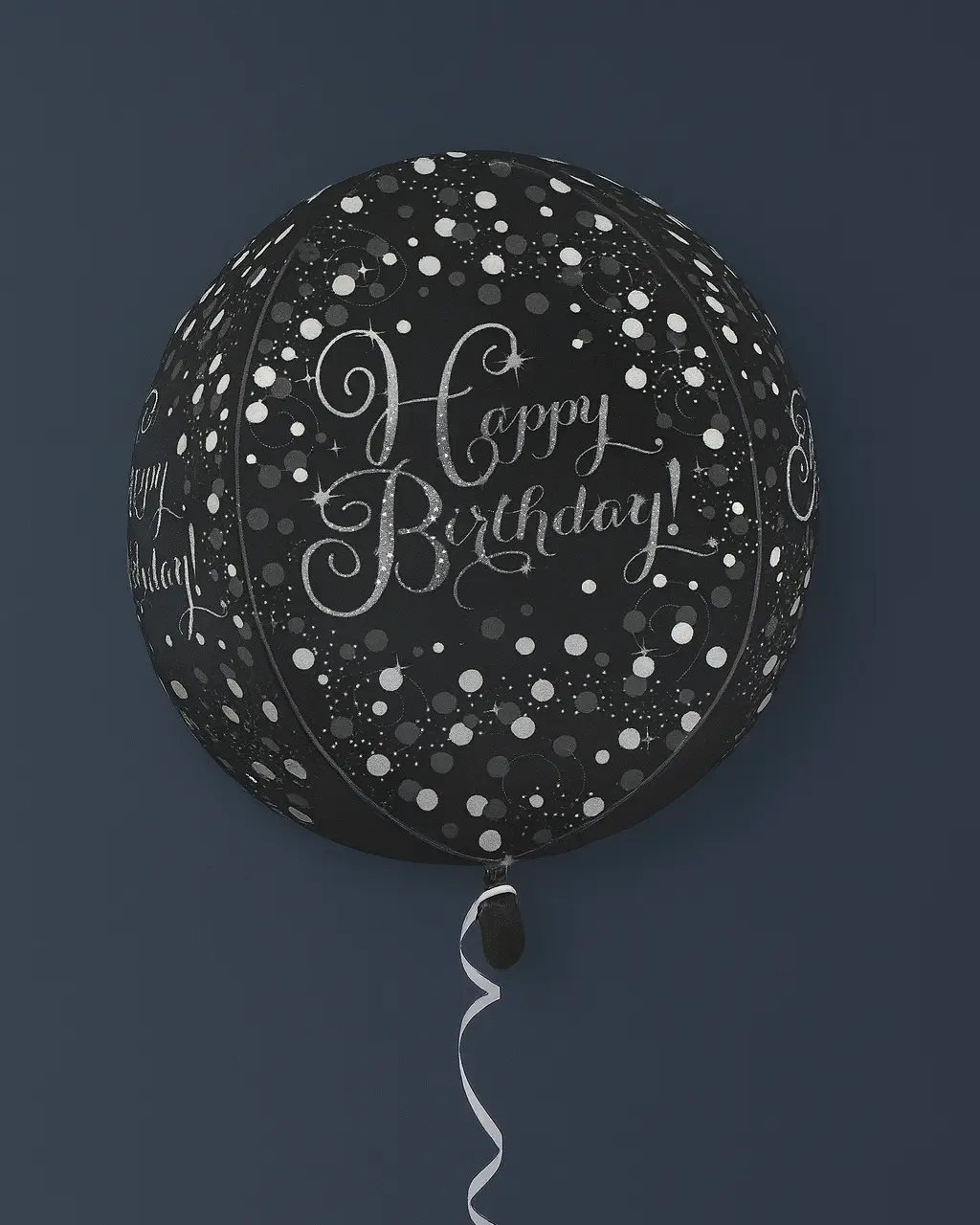 Globo negro con puntos plateados y frase happy birthday en estilo brillante.