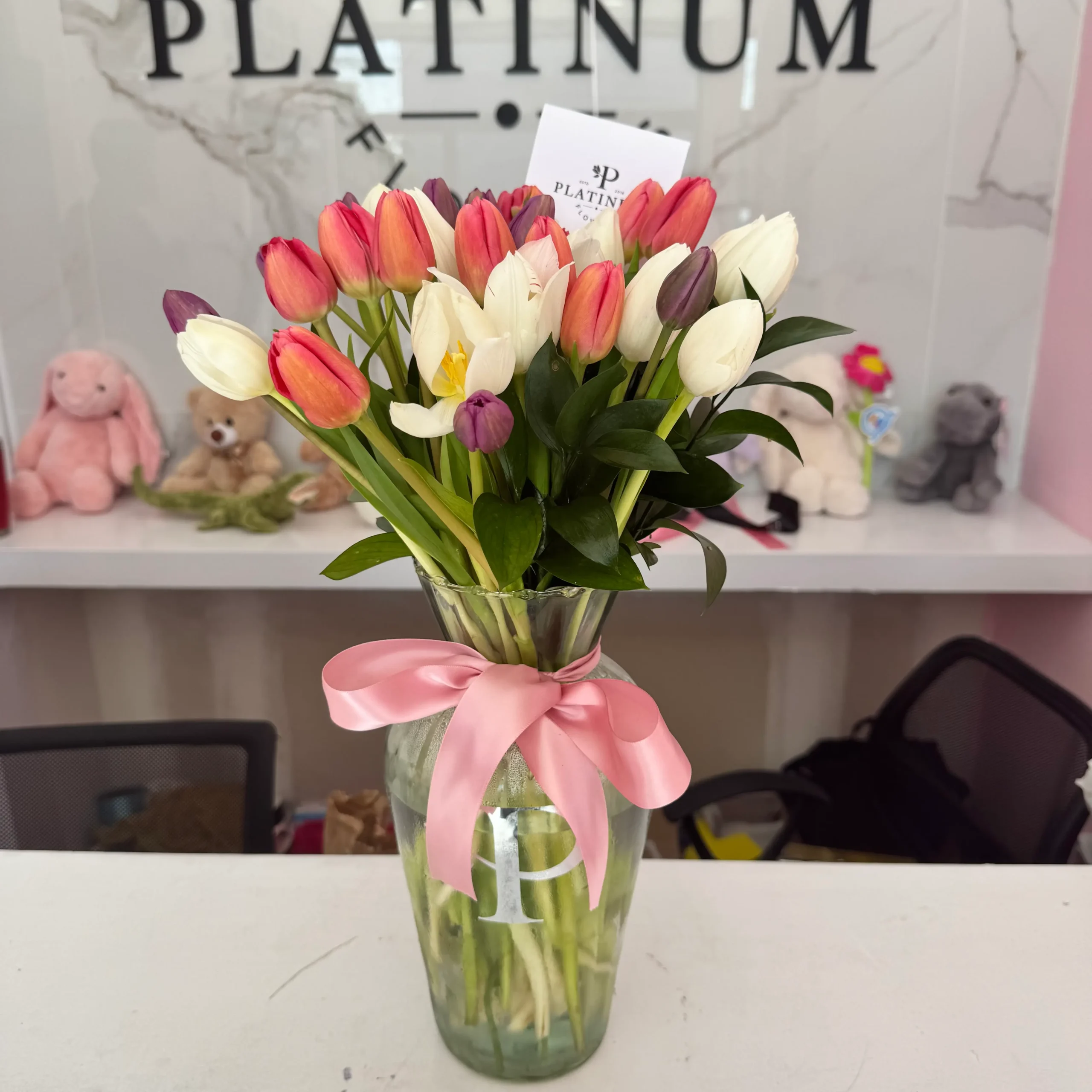 Convierte un día inolvidable para tu persona especial con un jarrón de 30 tulipanes, y sorpréndela con este arreglo Platinum.
